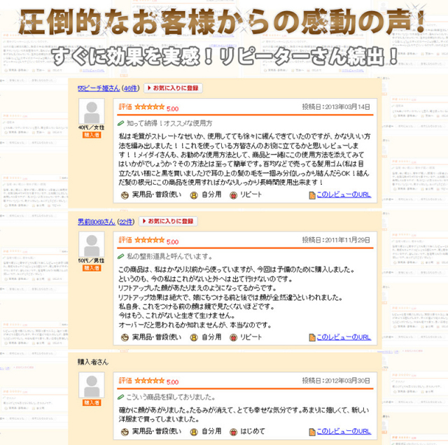 どうなんだろうと試しに購入してみました。 リフトアップ効果は絶大で友人にもつける前と後では 顔が全然違うといわれました。 リピ確定と予備にあと2個程購入します! |